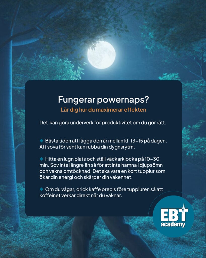 - Längd: 10–30 minuter (mer än så → risk för djupsömn och groggighet).